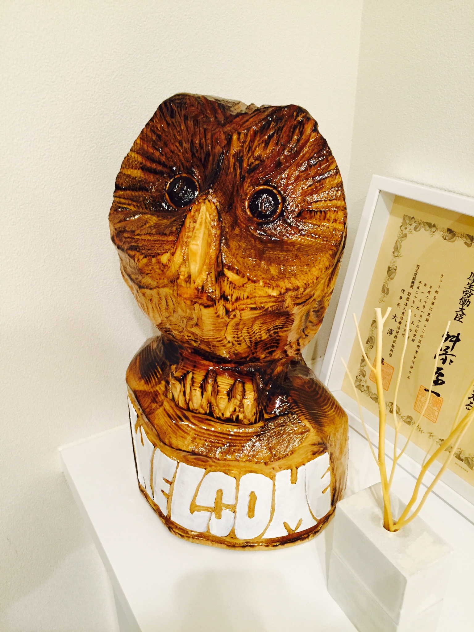 写真は鍼灸整骨院悠の守り神です。チェーンソーで削ったフクロウ!